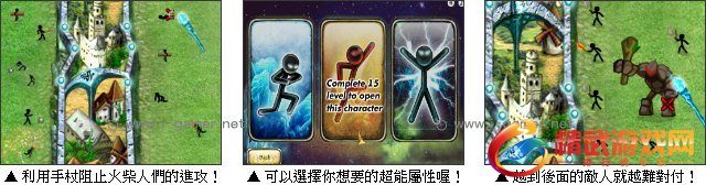 魔法城堡将遭受大批火柴人的进攻,这时三位火柴超人纷纷出来对抗这些恶徒,他们分别拥有电、冰和火的属性,属性不同所持有的魔法杖也就不同,快选择你所喜欢的火柴超人和他们一起对抗这些不速之客吧!