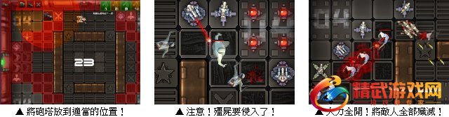 游戏操作:以键盘方向键操作机器人移动,滑鼠左键点击射击和放置砲塔,数字键1~5构建塔的快速键。