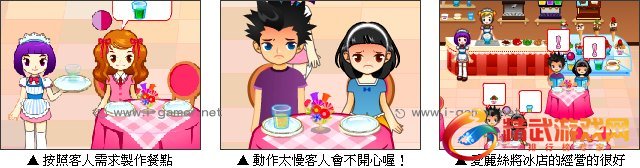 爱丽丝的冰店里提供了各式各样的饮料及冰品可让客人自由挑选,游戏中玩家要依照客人所点的餐点来供应,而且在制作餐点的过程中还会一直进来新的客人,所以动作一定要快,不然顾客等太久会生气的掉头走人喔。