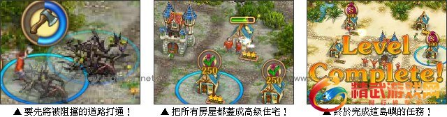 游戏操作:以滑鼠操作进行游戏,根据游戏中的提示,点击上方有钱袋的房子就会派人搬运金币回到城堡,点击有锤子标记的空地可以建造各种建筑,完成右上角的任务目标即可过关。