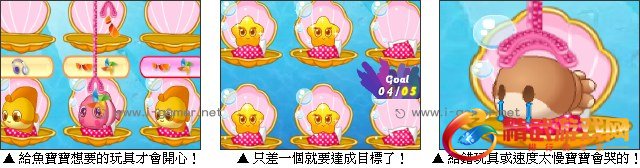 美丽的贝壳里抚育着很多鱼宝宝,牠们很俏皮,喜欢玩玩具,如果没有玩具的话还会哭的很伤心呢,现在照顾鱼宝宝的任务就落到美人鱼的身上啦,赶快让鱼宝宝们开心起来吧!