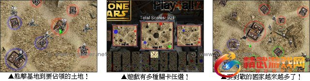 游戏操作:以滑鼠操作进行游戏,选定一个你的基地基地作为出发点,再点一个基地作为目的地。这样你的基地的一半部队就会被派到目的地,进攻时也一样。每个基地上的数值就是你拥有的士兵数量,你的士兵数量比敌人数量多时,你才能佔领敌人的基地。