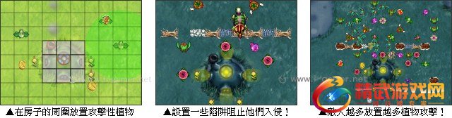 游戏操作:以滑鼠操作进行游戏。菜单栏:TUTORIAL是游戏教程,EASY是30波怪物,NORMAL是40波怪物,HARD是50波怪物,CHALLENGE是更多的挑战!提示:在怪物的出口处可以安置 TRAPS(陷阱),要使用不同的植物对待不同的怪物,放置好攻击的植物会比较有效!