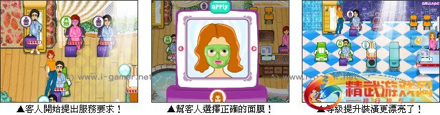 莎莎经营着一间健康温泉豪华浴宫,这里提供了很多服务,像是做SPA、泡温泉、修指甲、蒸气浴等等,各式各样让客人放鬆的服务,你要好好的服务客人让他们得到最大的享受,客人进门后会提出想要的服务,使用滑鼠拖曳他们到适当的区域,如果要敷面膜还要帮他们挑选到正确的面膜,黑石按摩要选择缺少的那块石头,关卡结束后可以升级店里面的所有设备。