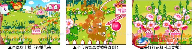 阿 Sue 家里的后花园好漂亮喔,有一大片草地可以种植不同的花朵,像是百合花、向日葵、玫瑰...等等可以挑选,首先先用小铲子再草皮上挖洞,接着再放入种子,就可以开始浇水,花会慢慢的发芽长大,旁边还会长出小杂草要用剪刀修剪,有时候还会有虫飞来记得用杀虫剂杀光否则花就会被吃光,最后长的最漂亮的花会挂上牌子就可以赚钱啰!