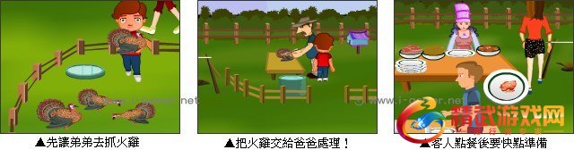 这个家庭式的小酒馆,是由爸爸、妈妈、姊姊、弟弟所一同经营的, 由于食物美味、服务良好,总是吸引相当多的客人来此享用,弟弟负责抓火鸡,在将火鸡交给爸爸处理,接着将处理好的火鸡交给妈妈火烤,姊姊负责招待客人,帮客人上菜,是个相当温馨有趣的小游戏喔!