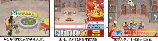 要在时间内完成客人的指示喔,不然客人就会生气走掉,左下角有个女佣,需要打扫或是浇花的时候点他去做就可以了,右下角有个维修人员,当机器出现维修图示的时候点他就可以啰,能不能让旅馆变的越来越豪华呢?快来试试看吧!