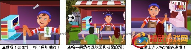 游戏操作:以滑鼠点击客人所需冰品按照对应的图示点选正确的颜色。
