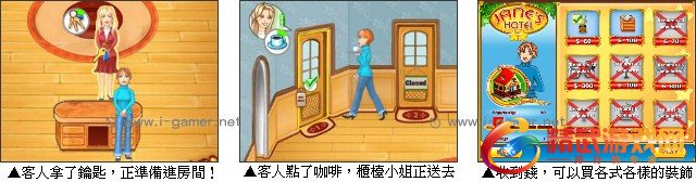 JANE 经营着一间休闲旅馆,正在学习着如何接待客人,以及满足他们的的需求,先给客人房间的钥匙,如果客人需要咖啡要记得帮他端过去喔,速度越快得到的小费也会更多,客人退房后会把小费放在桌上,别忘了要去收下,赚到的钱可以拿去买布置旅馆的东西,像是盆栽,报架等等,当客人多的时候还真是忙不过来呢!