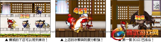 如果遇到 NPC "村长" 或 "京子",跟他们对话后会要求你打败下忍或上忍,其实是骗人的,并没有任务存在,除了老板娘以外的 NPC 几乎没有可以买道具或接任务,都是对话就可以了。到了枫城最右边会有传送点,进入后就是地图 "枫城入口处",那边有下忍可以用来练功,建议技能 "箭雨" 对付怪物,练到 20 等并不难。进入下一个传点那会有巴洛谷,先不要与牠对战,否则很容易失败。游戏的能力值 ( 力量 - 影响防御力与 "弓" 的攻击力,敏捷 - 影响 "箭" 的攻击力 ) 可以自己决定。BOSS 有三个,分别为巴洛谷、海怒斯与死灵王,建议等级高了在去打,不然很容易失败。
