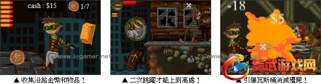 游戏操作:以键盘左右方向键操作移动,上键/空白键跳跃(按两次二次跳跃),下键跳下平台。滑鼠移动瞄準,左键射击,R键装子弹,P键暂停游戏。过关后,有足够的金钱可购买升级武器。