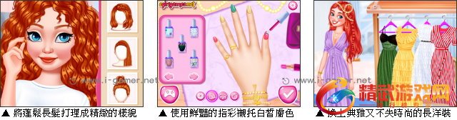 游戏操作:以滑鼠操作进行游戏,点击道具为公主们进行编发、美甲、装扮。