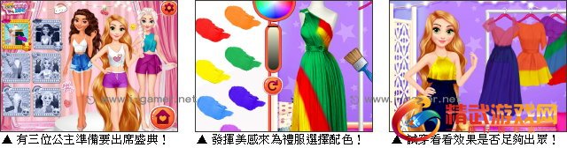 游戏操作:以滑鼠操作进行游戏,点选颜料为公主礼服上色。
