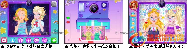 游戏操作:以滑鼠操作进行游戏,点击服装、发型、姿势装扮奥黛莉和伊丽莎,点击贴纸、滤镜美化照片。