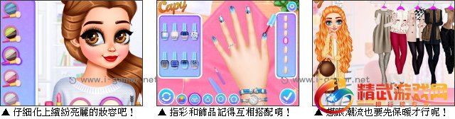 游戏操作:以滑鼠操作进行游戏,左键点击化妆品、服装、指甲油装扮公主们。