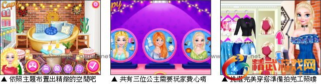 游戏操作:以滑鼠操作进行游戏,左键点击道具更换布置内容,点击服装、配件及发型装扮三位公主。