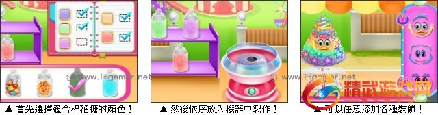 游戏操作:以滑鼠操作进行游戏,点选材料及道具制作棉花糖。