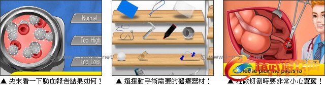 今天医院的急诊室来了一位盲肠炎的病人,我们一起帮助医生诊断病情,治疗病人吧!首先要看病人是否有剧烈疼痛,接下来经过抽血、验血报告出来后,就要进入动手术的流程啰!游戏中医生会提供指示如何操作,错误越少就能得到较高的分数。快来帮助病人早日康复吧!