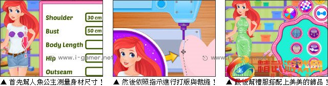 游戏操作:以滑鼠操作游戏进行,点击道具帮人鱼公主制作礼服。