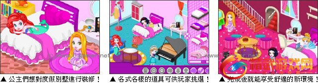公主们打算趁週末举办派对,并邀请好友到度假小屋度过愉快的假期,不过举办前要先把度假小屋重新装潢一下,现在就来帮公主们进行装修设计。游戏中有许多不同风格的家俱,从床、衣橱、沙发等,都可以依照各人喜好去装饰出自己喜爱的风格,此外还可以使用刷子为房间增添新的色彩。玩家们快来跟公主们设计出最漂亮的度假小屋吧!