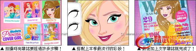 想设计一本属于你自己的时尚杂誌吗?那就快来试试这款 「摩登封面公主」 吧!每个女孩都幻想穿着漂亮衣服与化上最流行的彩妆成为时尚界的指标,而妳将扮演一位造型师,要来为迪士尼公主们设计一系列的造型,来拍摄杂誌封面照。玩家们快来为女孩们打扮打扮,拍好照再利用游戏中的素材进行编排,制作出一本属于妳的时尚装杂誌吧!