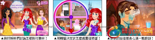 长发公主乐佩有一次在路上看到男朋友费林居然跟其他女生走在一起,让她大受打击。其他的迪士尼公主决定一起找出费林劈腿的证据,再去跟费林谈判。你可以选择用简讯、手写书信、当面泼他冷水、在墙上写字等等方式警告他,看看他的态度如何再决定要不要跟乐佩告发他!