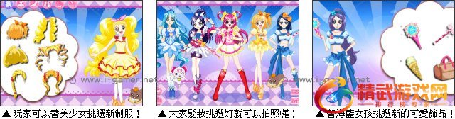 一款以人气动漫美少女为素材的装扮游戏,可爱的光之美少女要来改变不同的造型了,快来为她们量身订做出最特别的风格吧。游戏中有各式各样的素材可以选择搭配,不论是发型及服装饰品,都能任意为美少女换上玩家最喜爱的样子。多样式的变化让你发挥无限想像,现在我们就到游戏中为这些可爱的女孩们好好的打扮一下吧!