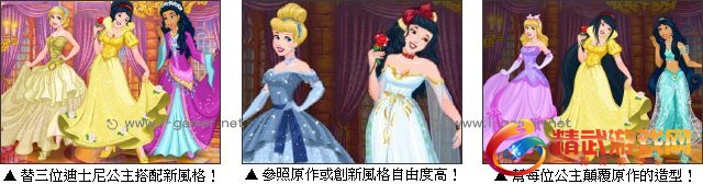 游戏操作:以滑鼠操作进行游戏,点击道具来设计制作漂亮的迪士尼公主服饰。