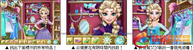 艾莎准备要参加王子的舞会,但她把衣橱弄得一团乱,因为物品非常的多,想要寻找衣服、饰品以及化妆品...等在哪里,就让我们帮帮艾莎在零乱的衣柜中找找看她要的东西在哪里吧。玩家在游戏中要把画面下方的物品都找出来,让她能成功赶上王子的舞会,但也不要忘记注意时间的流逝喔!