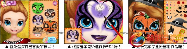 苏菲亚准备要去参加一年一度的万圣节派对,她希望脸上可以画上特别的脸部彩绘,现在就来帮她设计一款特殊造型吧。游戏中共有五种不同类型的彩绘,玩家可以挑选自己喜爱的图案,并依照指示开始帮苏菲亚画出属于她的风格样式,十分的有趣,赶紧来发挥你的丰富想像力,创造出独一无二的脸部彩绘吧!
