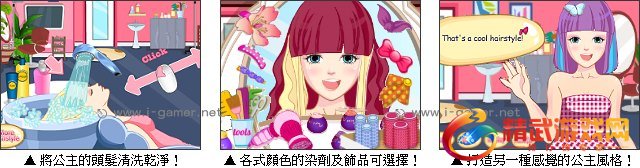 美丽的公主今天来到了发廊,她要求变换不同的发型,希望别再让大家对于公主造型,都是梦幻大波浪金发的刻板印象。那么就交由你来操刀了,有各种颜色的染发剂及不同大小的捲子可以挑选,最后再别上发饰,浪漫公主的新造型就由你来决定,赶快来帮她设计一下吧!