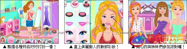 游戏操作:以滑鼠操作进行游戏,点击饰品给芭比化妆,服饰给芭比换装打扮,键盘方向键操作汽车移动,收集物品。