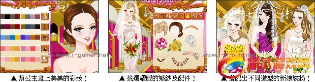 公主即将要完成终身大事,展开一场盛大的皇家婚礼,从头到脚的装扮可都不能马虎的。首先帮公主画上美丽的脸部彩妆,梳理浪漫时尚的发型,之后换上缤纷耀眼的婚纱礼服,别忘了还有最象徵性的捧花。快来帮新娘子好好的装扮,让公主顺利完成最幸福梦幻的世纪大婚礼!