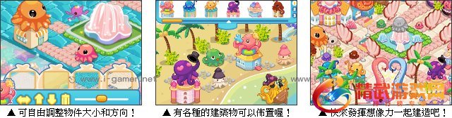 可爱的章鱼们想要建立属于自己的王国,快来发挥巧思帮它们设计一下吧!游戏画面上方有各种不同的建筑物和物品,玩家可以点选喜爱的图案,再拖动到合理的位置上进行布置喔,下方的按钮还可以调整大小和方向呢。游戏中共有四个不同的场景可以挑选,赶快来帮它们布置漂亮的章鱼王国吧!