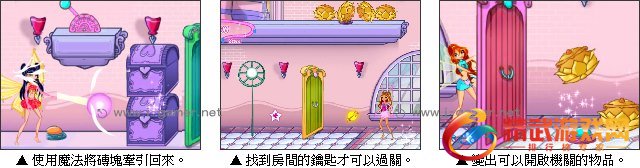 魔法俏佳人的世界里住着许多可爱精灵,但是城堡里面总是有各种不同的障碍物影响出入,虽然没有生命危险,为了让妖精们顺利抵达目的地,必须活用她们的魔法找到开关或是取得通关钥匙,某些地方还得飞到屋顶才能抵达,快来帮助她们完成任务吧!