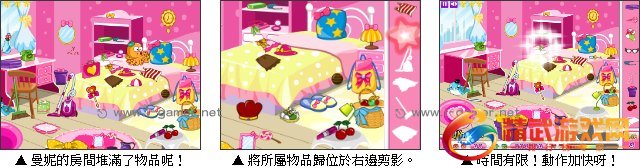 曼妮的闺房堆放了满满的物品,趁着周末假期,她打算来整理杂乱的房间。根据游戏画面右侧物品剪影,找出房间里相对应的物品,滑鼠点击后物品自动归位,在规定时间内找出所有物品才能进入下一关,总共有三次提示功能喔。一起来考验一下眼力帮曼妮整理闺房吧!