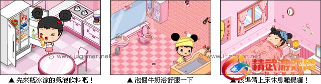 大头妹的别墅到底有几间房子呢?而且每一间的装潢摆设是什么样子啊?游戏中玩家可以点击大头妹让她四处走动,渴了可坐在沙发上泡茶,肚子饿了就到厨房制作餐点,累了就洗个澡上床睡觉吧!好悠闲喔,快来玩玩看大头妹居家生活吧!