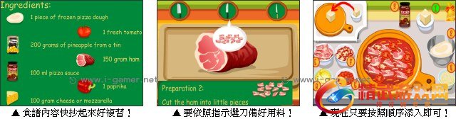 游戏操作:以滑鼠操作进行游戏,选择合适的刀具切削,然后按照提示拖动滑鼠完成比萨的制作。