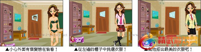游戏中的女主角要准备换衣服出门了,但是在门口有个变态一直在偷看,快点从左边的柜子里帮他换上最美的衣服吧,从发型到鞋子,还有包包跟装饰品,一样都不能少喔!