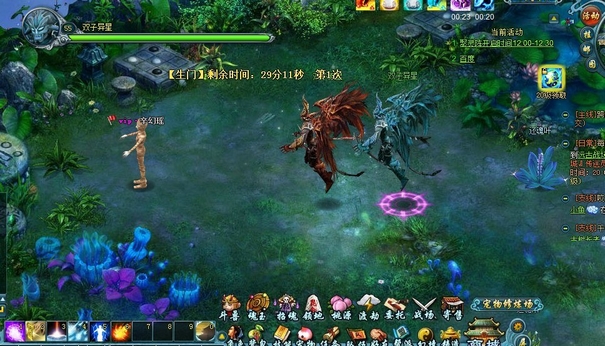在生门里,破军就起到了最重要的作用。首先生门两个BOSS相辅相生,如果只打死其中一个,另一个会迅速衍生出新的,因此需要同时击破,两手都要抓。这时需要两个破军使用嘲讽各拉一个,双天殇分别下手,铃星可以左右救援,同时当眩光斧出现时要及时干掉眩光斧。这里要注意的是,双子会把玩家变形为鱼和木乃伊,被变形后将无法攻击,场景内会有还魂叶和还魂果,分别使用后可解除变身(还魂叶解除木乃伊效果、还魂果解除鱼效果),但是还魂叶和还魂果是有数量限制的哦。双子星血厚防高,极耗功力,不小心还会把你的装备耐久度打到0,所以要关注一下系统提示,及时修理装备。另外打这一关也是很耗时间的,因为不能挂机,所以亲爱的玩家们,上好厕所,准备战斗吧!