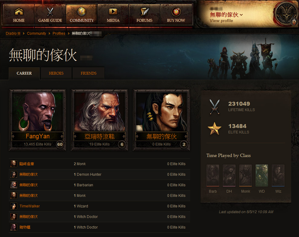 个人首页简单列出帐号中所有角色 & 精英、怪物击杀数