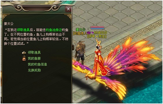 垂钓一直是人民群众喜闻乐见娱乐休闲方式,钓鱼不仅可以陶冶情操还可以赚到晚餐鱼。哈哈!在wan71《洪荒神话》也将垂钓乐趣带到了游戏当中,在宗派圣火期间(每天19:30~20:00),所有宗派通过快速回宗功能返回宗派广场(飘渺城占领宗派则返回飘渺城)。在宗派广场城内的钓鱼池附近与姜太公交谈
