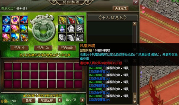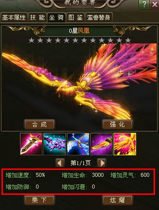 凤凰封镇使用后可获得极品凤凰坐骑,不但属性强劲,更兼有有史以来最华丽的造型。除此之外,阴阳秘藏还能获得超级经验药,各色三级属性宝石,80级注灵石等稀罕的道具。