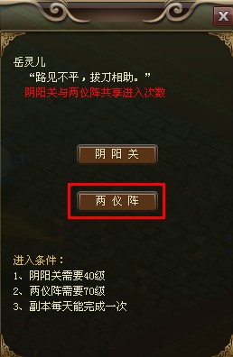 通过天神城npc(岳灵儿),可以进入两仪阵。两仪阵需求进入等级为≥70级。