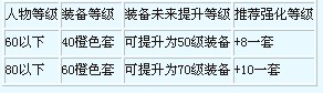 因为神佑套装存在升级性,所以,60以下即推荐40橙色套装(淘宝或者找其他人购买);又因为60级以下属于过度阶段,固无需强化太高,而且低级装备是无法转移强化给高级装备的。+8的加成属性和实用性是比较好的,PK、抢BOSS、争夺都够用了。