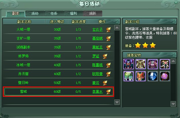 4399神魔遮天全新开通了60级副本--雪域副本,这个副本难度高,掉落60级紫色套装,吸引力非常强。 1、进入副本:点击右上角“活”--“副本”自动寻路到李黑水,对话即可进入副本,建议组队进入哦。 2、雪域副本全景: 3、战斗截图: