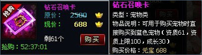 活动内容:在新服开启的前三天,商城抢购区将有钻石召唤卡、VIP月卡、优惠大礼包等打折商品大甩卖!