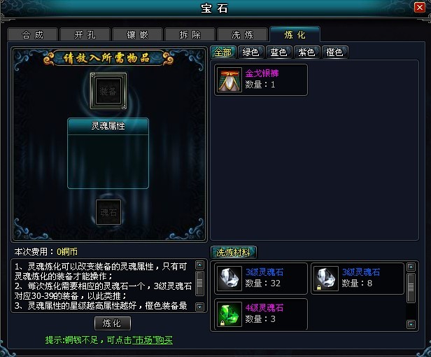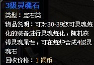 2.不同等级装备每次炼化时需要消耗一个相应等级的灵魂石,3级灵魂石对应30-39的装备,4级灵魂石对应40-49的装备,以此类推;