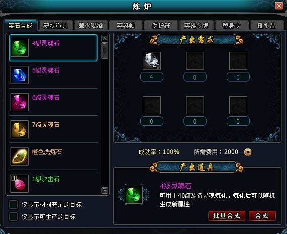 1.灵魂石合成,点击游戏右下角“炼炉”--“宝石合成”。