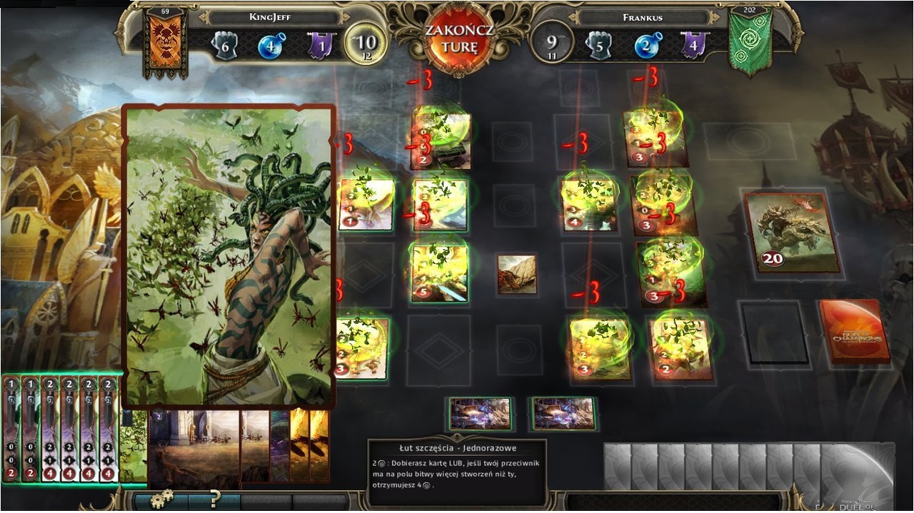 《魔法门:冠军对决》是魔法门系列的最新作品,游戏以纷争不断的 Ashan 世界为背景,在这个独具特色的大陆上,充满著神奇生物,魔法和英雄的传说。卡牌分为5 大类,分别是英雄卡 hero、单位卡 unit、事件卡 event、法术卡 spell 以及机会卡 fortune。玩家将选择一位英雄,以及5 种事件作为开始,利用卡片的特殊能力来攻击对手,直到对方英雄被击败为止。每张卡牌资料详细,玩家可以收集,也可以通过战胜对手获得,或者从游戏的商店中花钱购买。